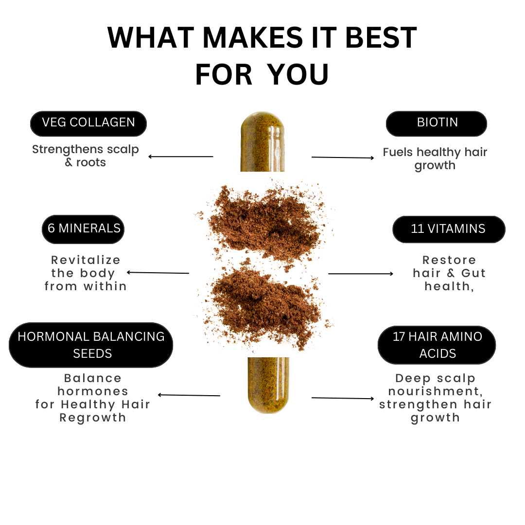 It restores scalp health with Ashwagandha, Biotin, Amino Acids, and essential vitamins, balancing hormones, reducing stress, and supporting follicle strength.