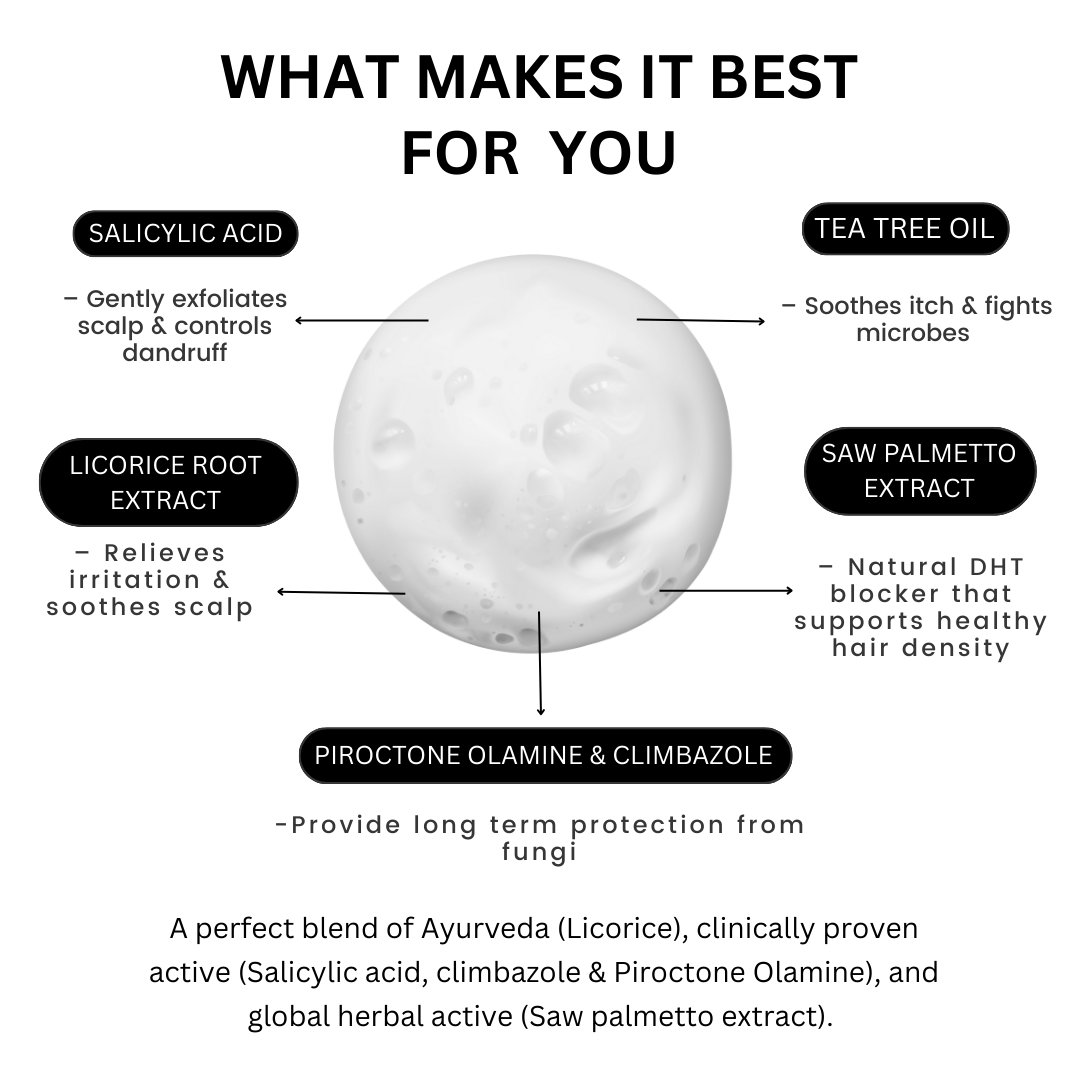 Formulated with Salicylic Acid, Tea Tree Oil, Climbazole, and Licorice, it removes buildup, reduces flakes, and soothes scalp irritation gently.